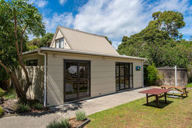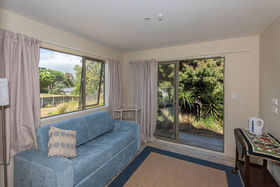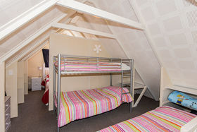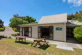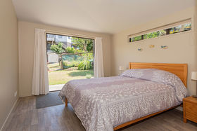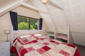 An original "A" frame garage that was renovated and refurbished by Coastal Homes to create a character bach. With its open plan living area including modern kitchen complete with island, main bedroom, bathroom and storage room (great for storing linens etc for when booked by Bach Stay) on the ground floor with double doors opening out to the garden from both the living area and the bedroom, it is a veritable "Tardis". A clever stairway leads to an attic with exposed beams and clever shelving with room via a partition for a double bedroom area plus bunk beds and a further single bed.